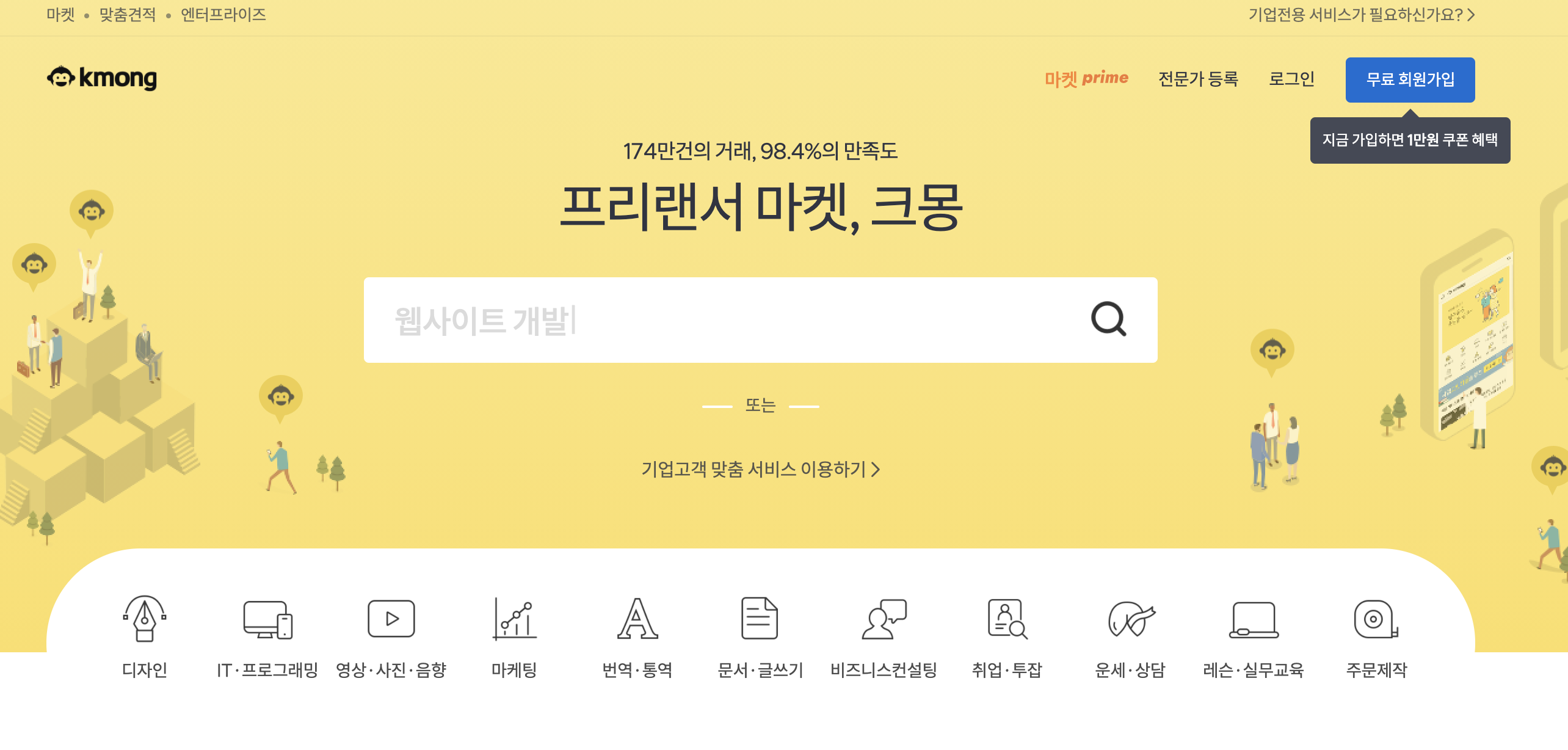 먼저 크몽 사이트에 들어오면 오른쪽 위에 회원가입이 보인다. 전문가 등록을 하고 싶어도 회원가입이 먼저이기 때문에